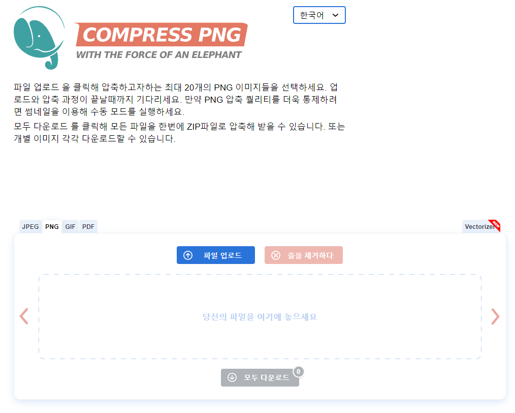 이미지를 파일 업로드 버튼을 눌러서 업로드하고 압축을 하고 난 이후에 다운로드만 하면 되지만 최대 20장만 가능하다는 점은 약간의 단점이 될 수 있습니다. 하지만 나의 경우에는 블로그의 썸네일 정도만 이미지 압축을 하기에 크게 문제가 되지는 않는다.